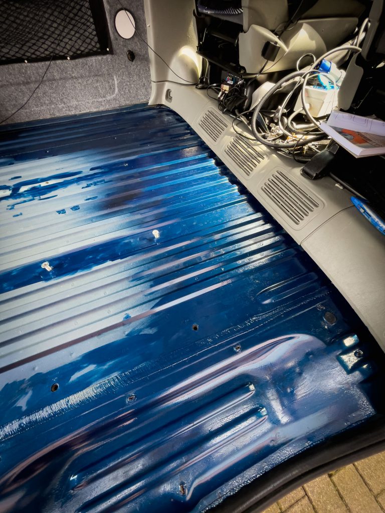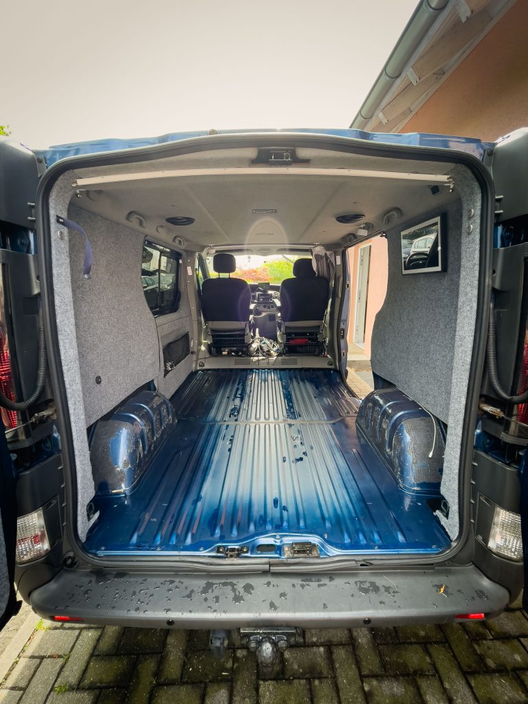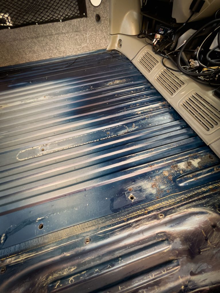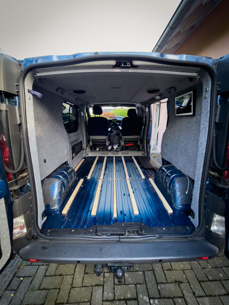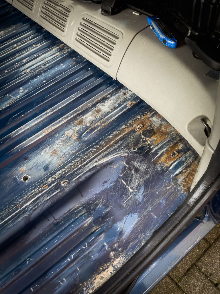 Die ausgebauten Bodenplatten waren aus 8 mm dicken OSB-Platten, die lediglich auf die ursprüngliche Bodenmatte des Trafic geschraubt wurden – dazu ging die Vordere auch noch unglücklich über die Einstiegsblechverkleidung, was mir nie so gefallen hat. Da, wo eigentlich die Sitze montiert waren, wurden einfache Holzleisten verschraubt, auf die dann die Platten geschraubt wurden. Was soll ich sagen: Das hat natürlich gemoddert ohne Ende. Die Matte war komplett schimmelig, an der einen oder anderen Ecke gab es auch Rost am Chassis. Also wirklich „alles raus“!