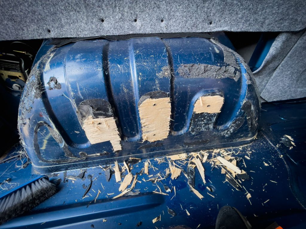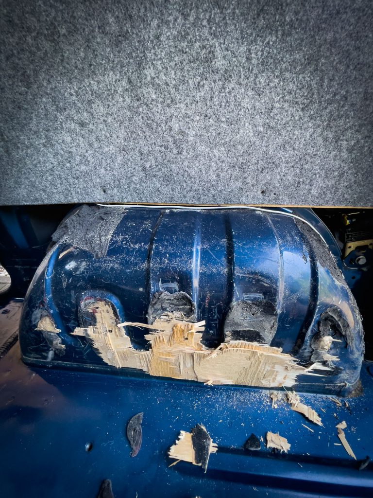Der Boden war freigelegt. Jetzt mache ich mal noch schnell die Radkästen ab – weit gefehlt! Die waren nämlich wie mit Beton ans Metall geklebt. Ich hatte keine Chance, die Dinger abzubekommen. Um es kurz zu machen: Ich habe gesägt, ich habe mit Gewalt daran gezogen, ich habe mit einem Meißel versucht, das Holz vom Metall abzustemmen. Letztendlich hat die Aktion ungelogen 7 Stunden in Anspruch genommen, bis ich die großen Holzplatten abbekommen habe🙈