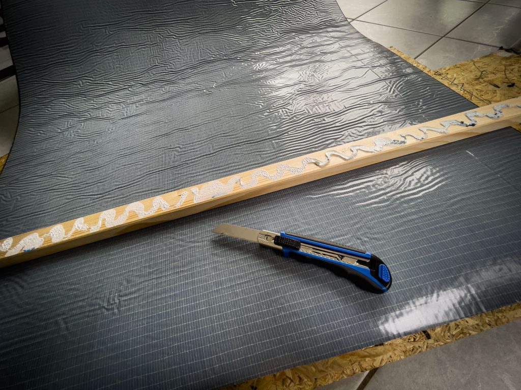 Im nächsten Schritt ging es dem Rost an den Kragen. Als nächstes konnte ich schon das Lattengerüst mit Sikaflex verkleben, auf dem später die Bodenplatten verschraubt werden. Ich habe mich hier wieder für OSB entschieden. Von meiner ehemaligen Sprecherkabine aus dem Tonstudio hatte ich noch vier Platten mit 18 mm Stärke im Keller, die eigentlich passen und stabil genug sein sollten.