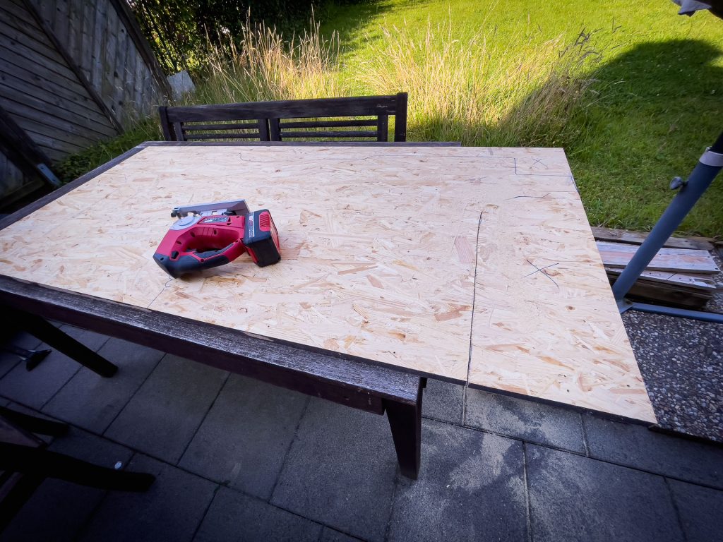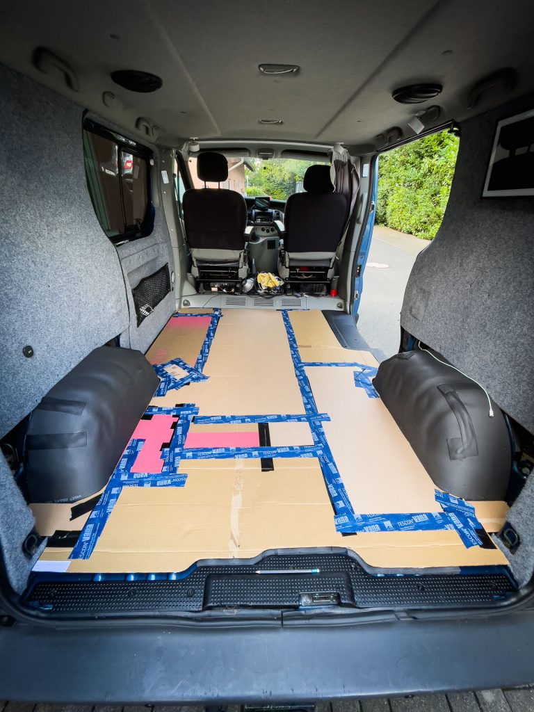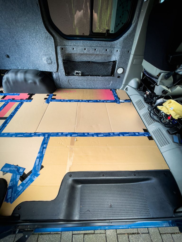 Da die originale Bodenmatte leider so unfassbar eklig (und dazu auch noch an mehreren Stellen gebrochen) war, habe ich mir eine Schablone aus Karton gebastelt. Das hat auch gefühlt ewig gedauert, sollte sich am Ende aber wirklich bewähren. Ich habe die fertige Schablone auf die OSB-Platten gelegt, den Umriss angezeichnet, und dann musste ich nur noch mit der Stichsäge die Konturen nachfahren. Die Platten haben perfekt gepasst, und ich musste nichts mehr korrigieren😅