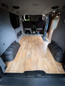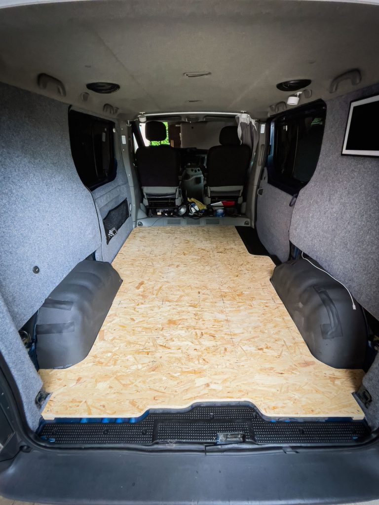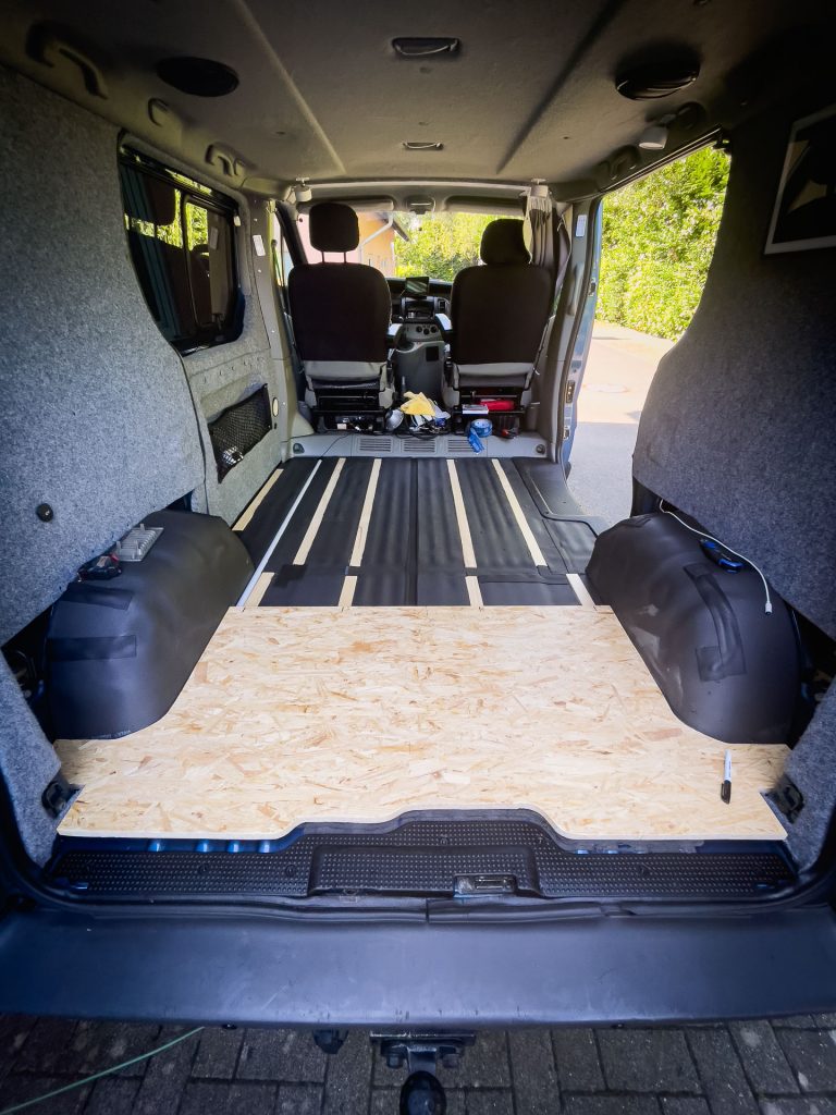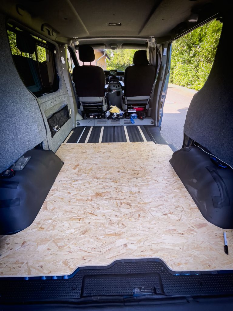 Die zugeschnittenen OSB-Platten habe ich an den verklebten Latten festgeschraubt. Perfekt! Am Ende habe ich dann noch einen normalen PVC Boden verlegt und verklebt. Und schon war der neue Busboden fertig😉