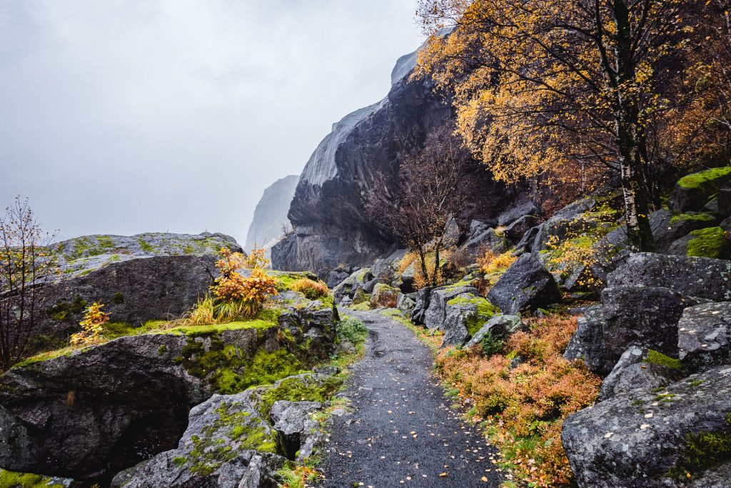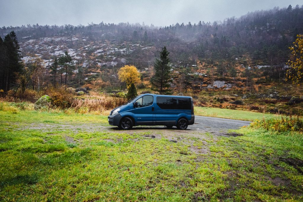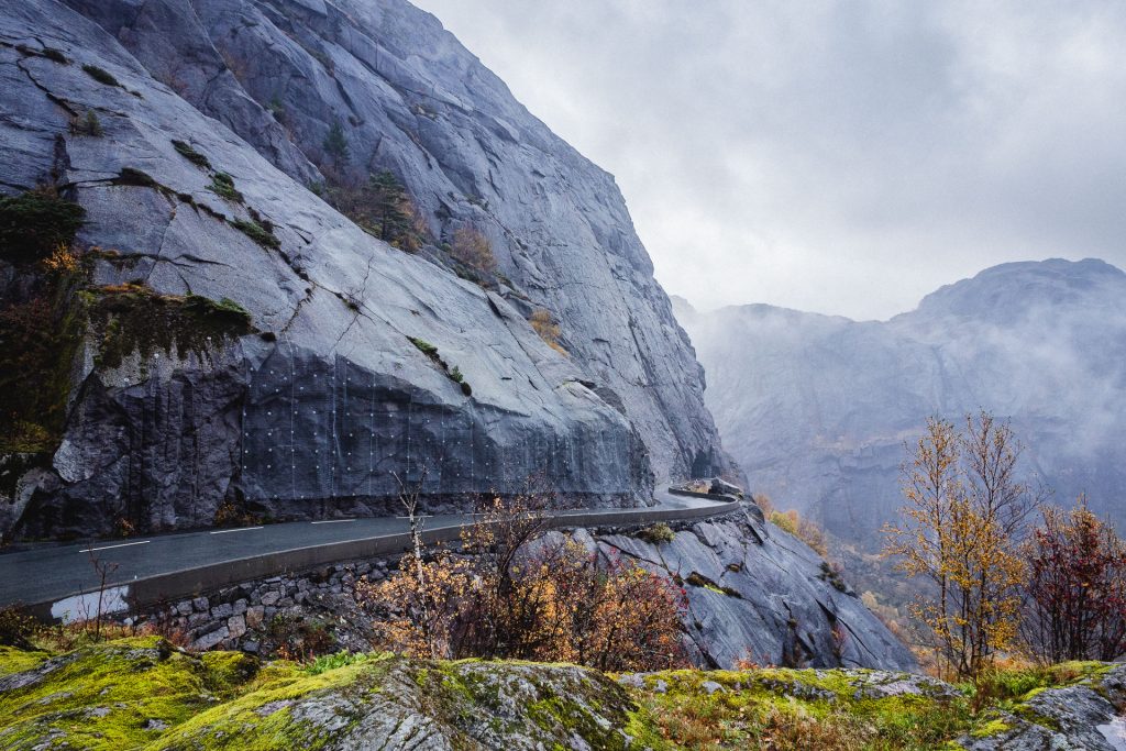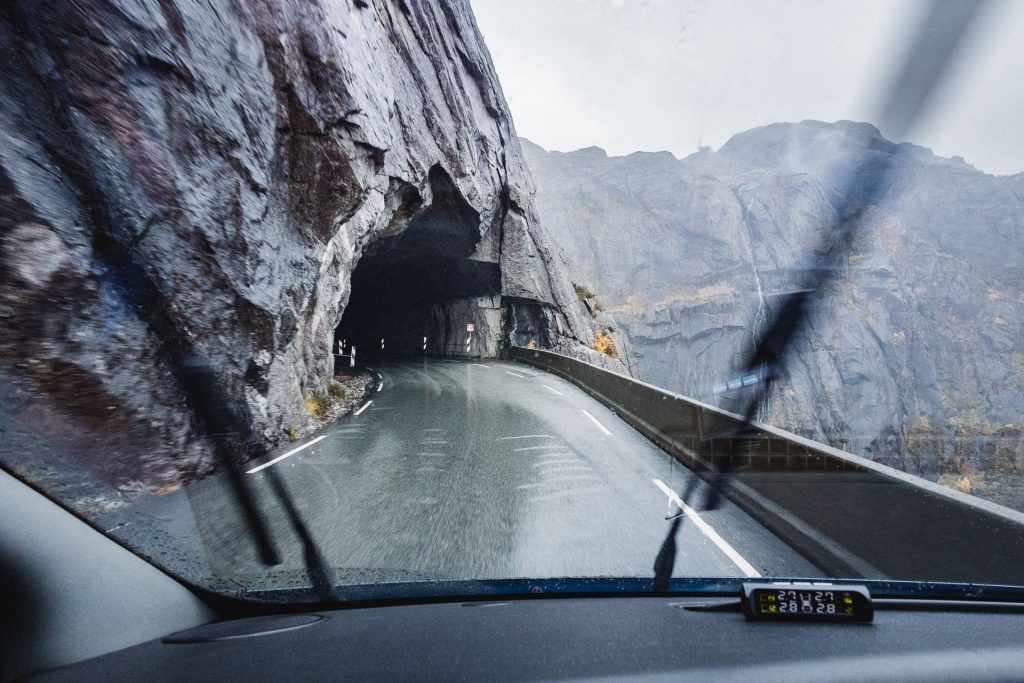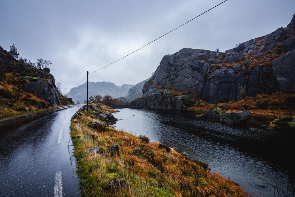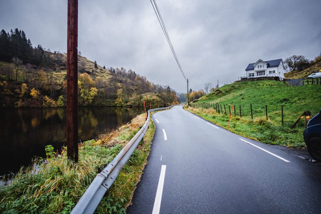Wir starten in Stavanger gegen 11 Uhr im strömenden Regen. Das Wetter macht es uns diesmal wirklich leicht „Tschüss“ zu sagen. Also fahren wir wieder die E39 in Richtung Kristiansand. Nach ca. 70 Kilometern lotst uns das Navigationssystem plötzlich auf eine Landstraße – die mir wirklich alles abfordert. Sagen wir es so: Es gibt gefühlt nur eine Spur und kaum Ausweichmöglichkeiten. Hoffentlich ist es nur ein kleines Stück!