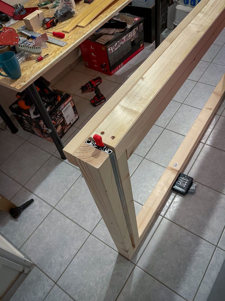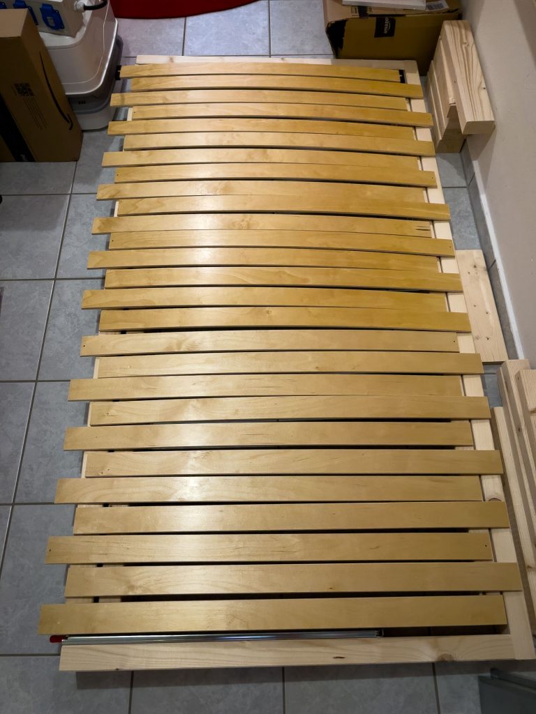 Das Gestell habe ich so gebaut, wie es im Video gezeigt wurde. Allerdings habe ich mich für größere Dachlatten und einen echten Lattenrost entschieden. Die Auszüge sind Schwerlastauszüge, die man bis 250 kg belasten kann.