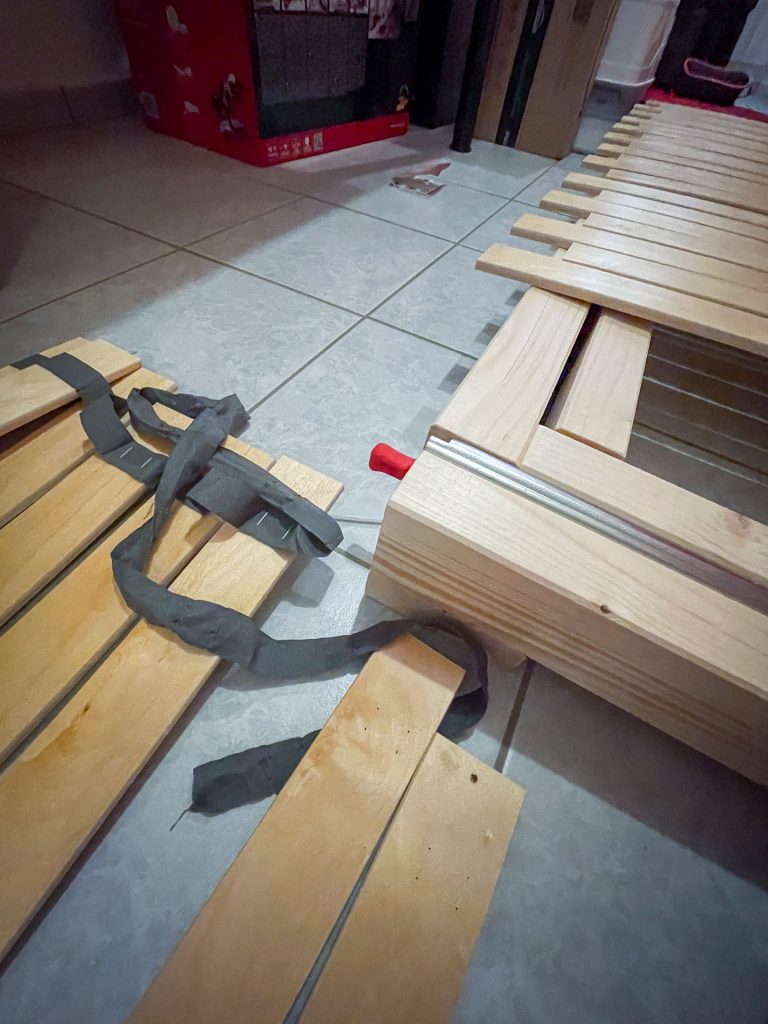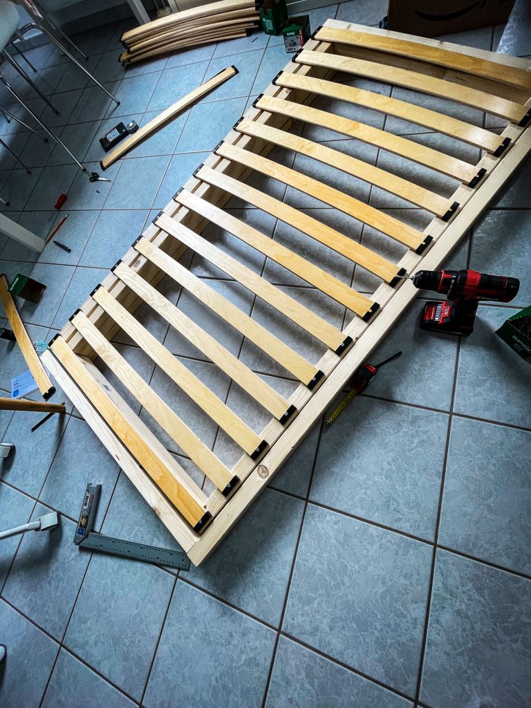 Allerdings habe ich mich noch während des Baus dazu entschlossen, dass ich doch lieber ein Querbett machen möchte, das im hinteren Bereich des Busses ist. Also habe ich das Bettgestell auf 156 cm Breite reduziert, dafür kann man den Auszug jetzt bis 150 cm machen. Das klingt im ersten Moment wenig, aber ich bin mit 1,74 Metern nicht der Größte (das weiß ich seit meiner Tinder-Zeit🙈😂) und in den seltensten Fällen liege ich komplett ausgestreckt im Bett. Ich kann direkt vorwegnehmen: Ich finde die Lösung super bequem, und für mich war das die beste Entscheidung, das Bett so zu machen.
