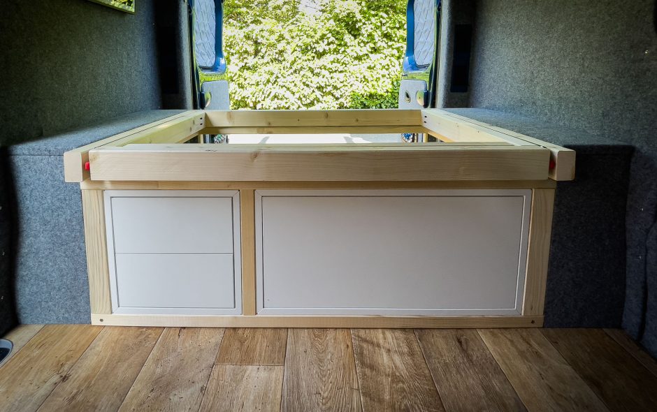 Die ganz kurze Variante: Ich habe das Bett als Kasten, der zwischen die Radkästen kommt, gebaut. Unter dem Gestell finden jetzt zwei kleine IKEA Regale Platz – ich entscheide mich für einen Schubladenwürfel sowie ein kleines Regal der „Eket“ Reihe, die ich in das Gestell einpassen kann. Der Vorteil an den Schubladen: Die haben schon „Push/Lock“, das Regal auch, allerdings wird die Tür nur von einem Magneten gehalten. Hier entscheide ich mich später noch für einen kleinen Verschlussriegel, mit dem die Schranktüre während der Fahrt fixiert wird. Durch die neuen Elemente bekomme ich endlich Platz für alle Basics wie Besteck, Koch- und Essgeschirr, Kocher und Töpfe!