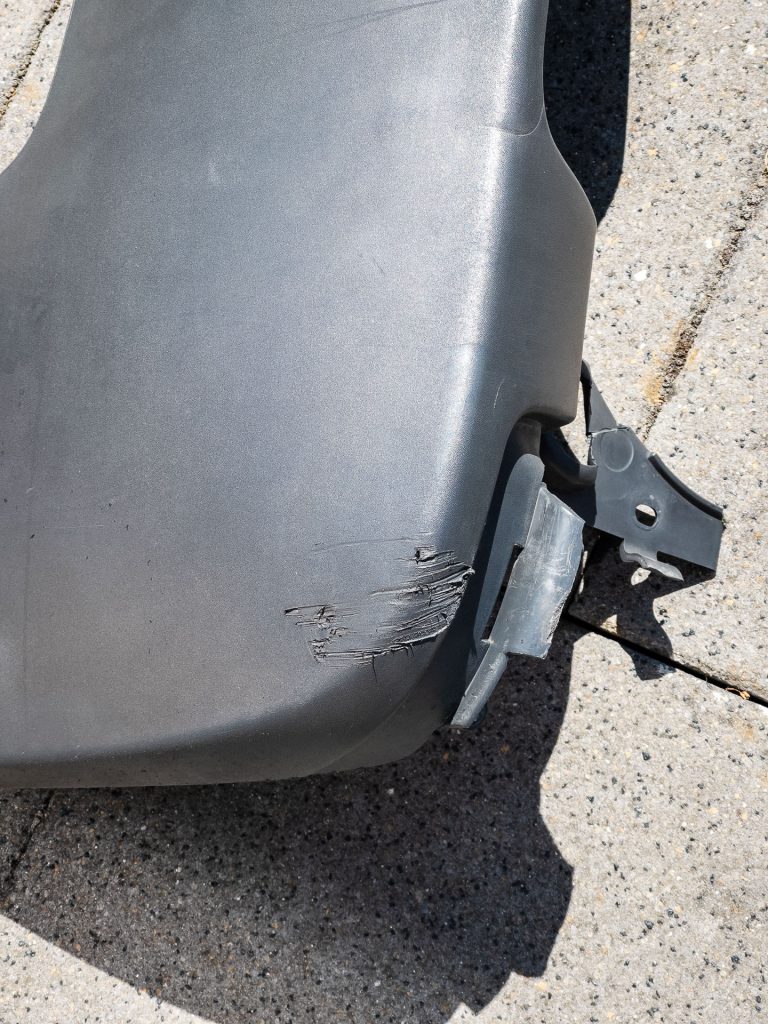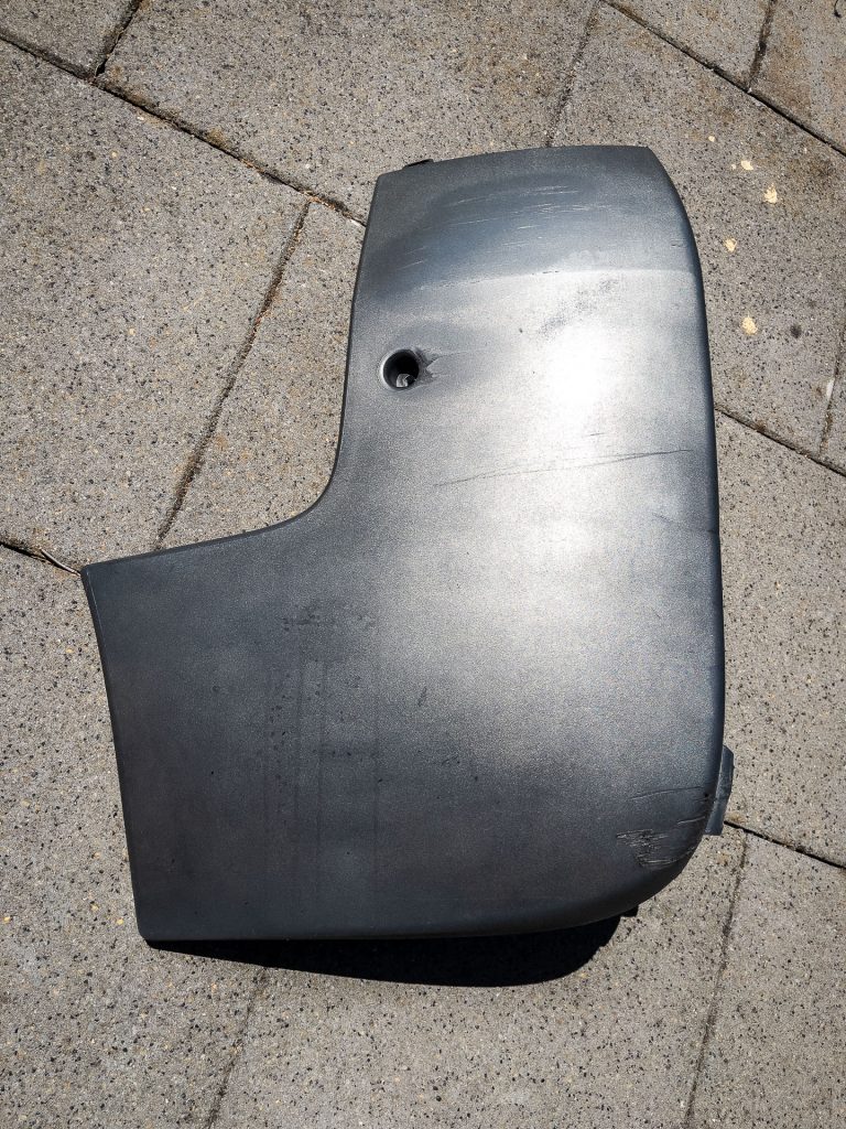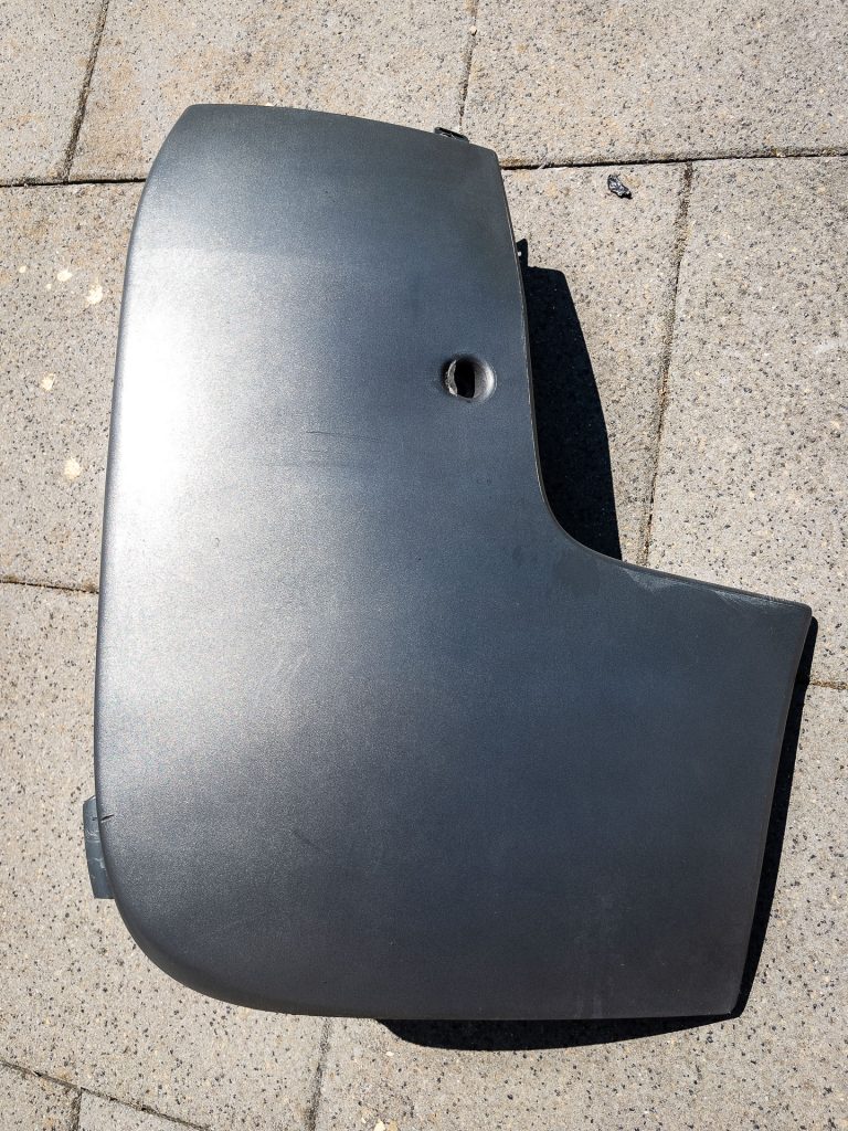 Ich musste nach dem Frust des ersten Lackierversuchs alles erst einmal ein paar Tage sacken lassen. In der Zwischenzeit habe ich den Mipa-Lack zum Rollen neu bestellt. Eigentlich wollte ich auch die wirklich buchstäblich versauten Plastikteile einfach neu bestellen. Allerdings kostet so ein Satz Leisten pro Seite über 100 Euro, die Stoßstange kostet auch noch einmal gute 100 Euro ohne Versand. Das ist einfach nicht drin. Abbeizen der alten Farbe geht laut Hersteller nicht, also bleibt nur Abschleifen.
