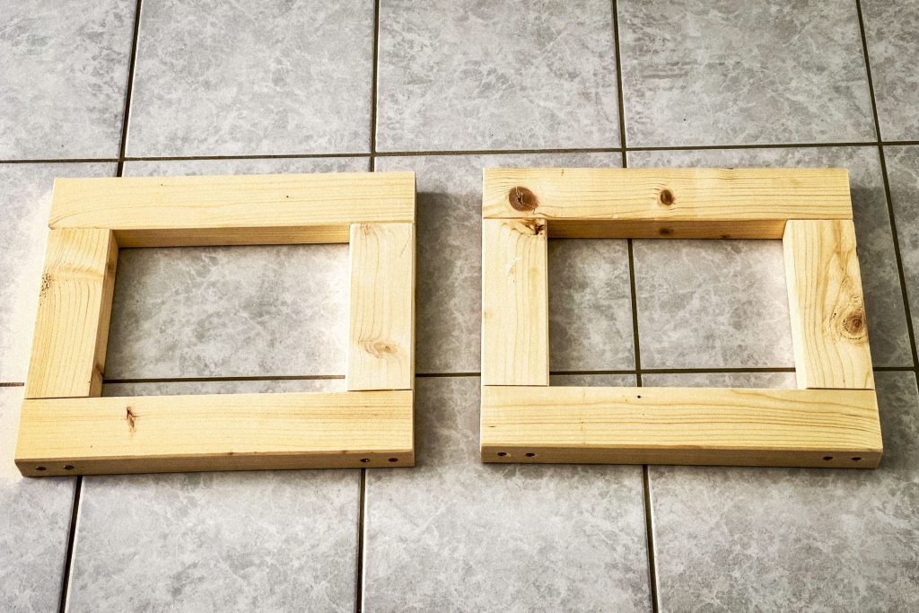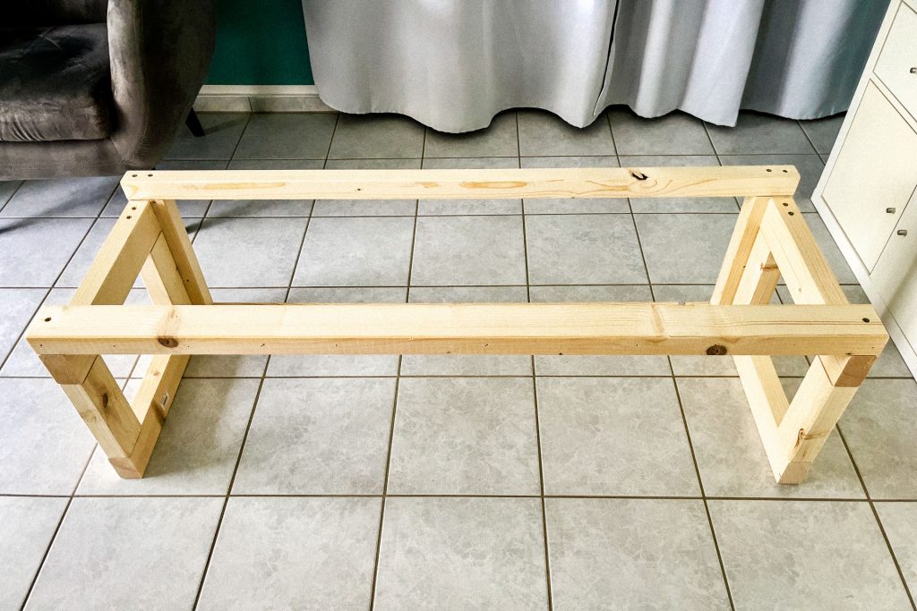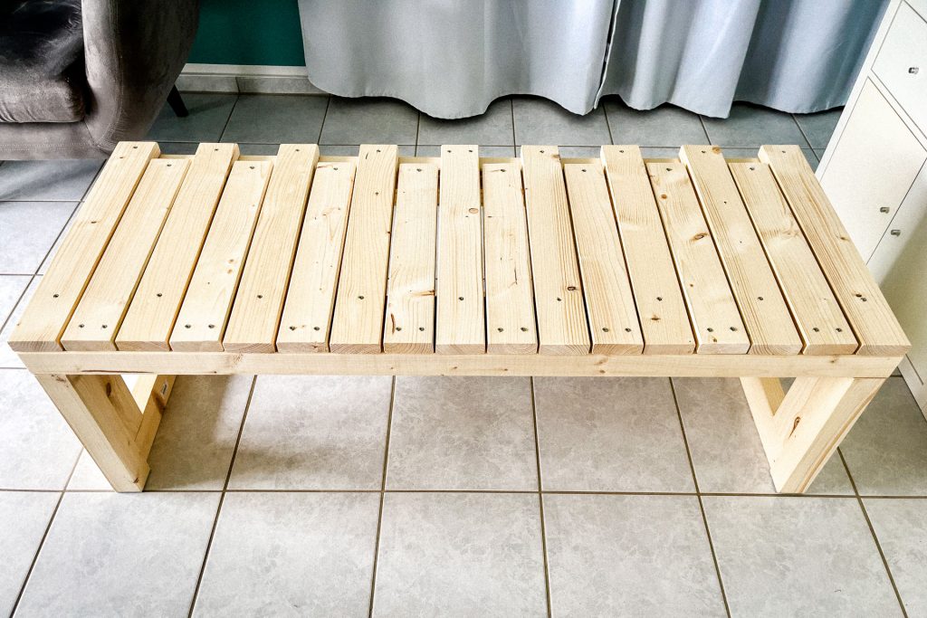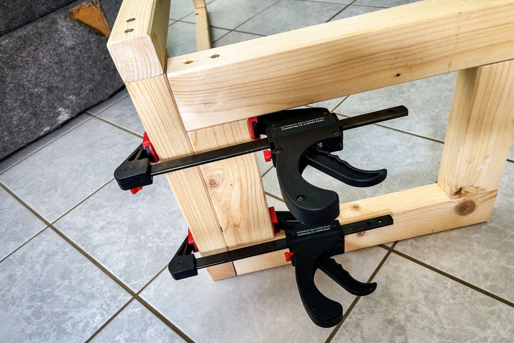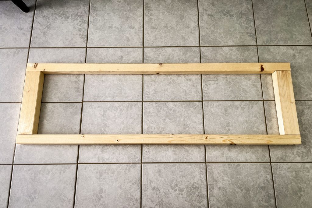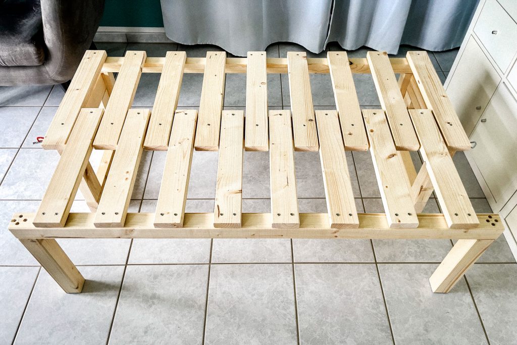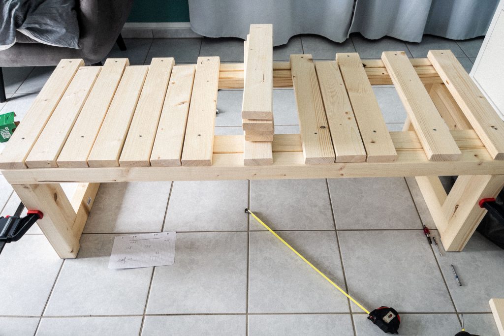 Ich baue erst ein Gestell, das ich quasi über die Kisten stellen kann. Danach konstruiere ich den Auszug und bastle dann noch eine Art Lattenrost, der zwar deutlich steifer ist als ein normaler Lattenrost, aber ich möchte die eine Seite der Bank tagsüber zumindest als Behelfstisch nutzen können. So ist die Fläche stabil und macht, was sie soll.