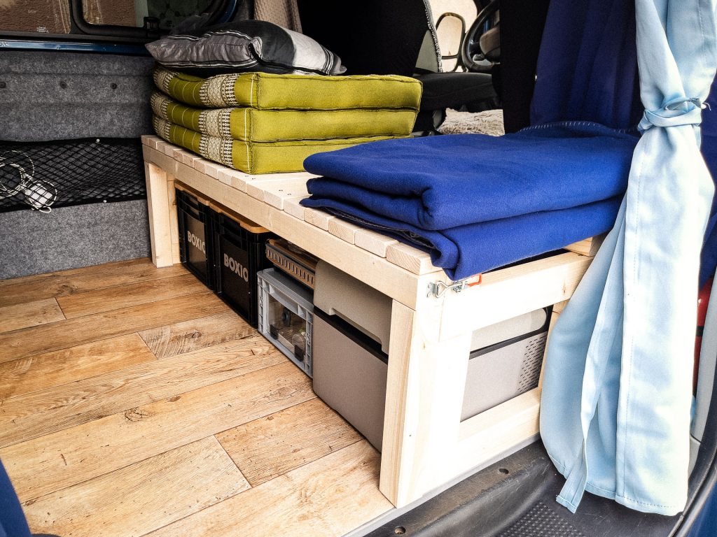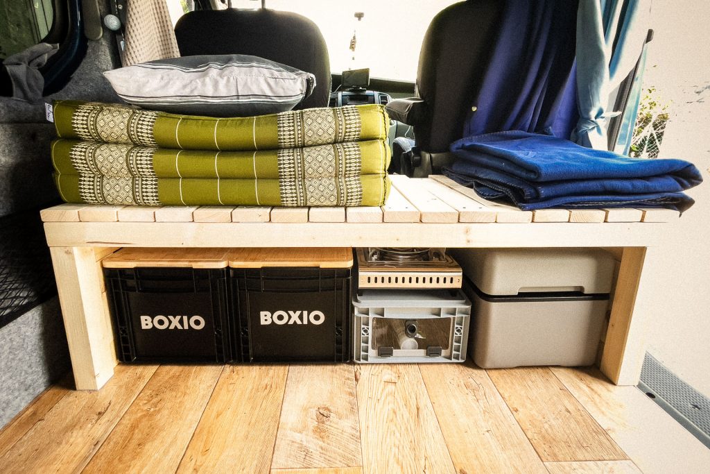 Die Boxio Wash hat sich auf der letzten Fahrt wieder bewährt – die muss also bleiben. Generell finde ich das Konzept vorne mit den Euroboxen prima. So komme ich auf die Idee, mir ein Bett über die Kisten zu bauen. Aber wie? Gerne wieder mit Auszug, aber die Schwerlastauszüge hatten sich schon zweimal nicht bewährt. Also schaue ich mal wieder unzählige YouTube-Videos, um trotzdem ratlos zurück an den Schreibtisch zu kehren. Im Grunde ist klar: Es muss in etwa so werden wie die beiden ersten Betten, die ich gebaut habe, nur eben ohne den Schwerlastauszug.
