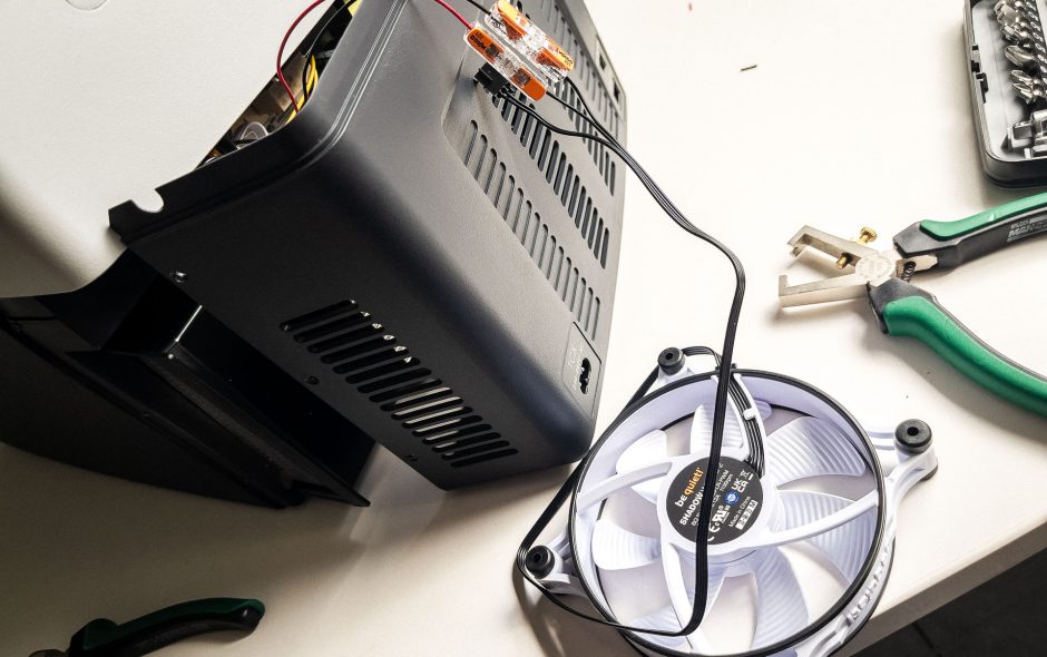 Der Lüfter der Tropicool’s ist ein normaler 12-cm-PC-Lüfter. Ich habe lange gesucht, bis ich den passenden Lüfter gefunden habe: einen „be quiet! Shadow Wings 2″-Lüfter. Ich habe diesen Lüfter tatsächlich schon damals in meine 21 Liter Box gebaut – und der Unterschied ist wirklich dramatisch. Mit dem von Dometic eingebauten Lüfter klingen die Truhen wie ein halber Hubschrauber, mit den „be quiet“ Lüftern ist alles super leise. Ja, man hört den Lüfter immer noch, aber er ist wirklich viel leiser! Und ich bin wirklich geräuschempfindlich, komme so aber gut klar damit.